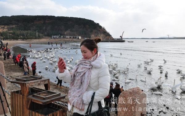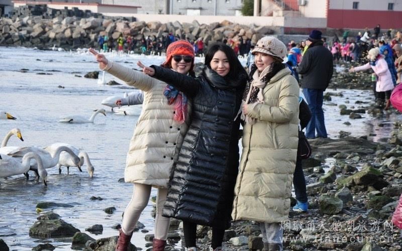 在多姿多彩的景色面前,游人们忘却了冬季的寒冷。摄影师们手持照相机盯着水面,扑捉着天鹅的优雅身姿,按快门的手被冻僵也全然不顾。年轻的姑娘们也忘不了和天鹅比美,在天鹅面前摆出各种姿势留下美丽的瞬间。