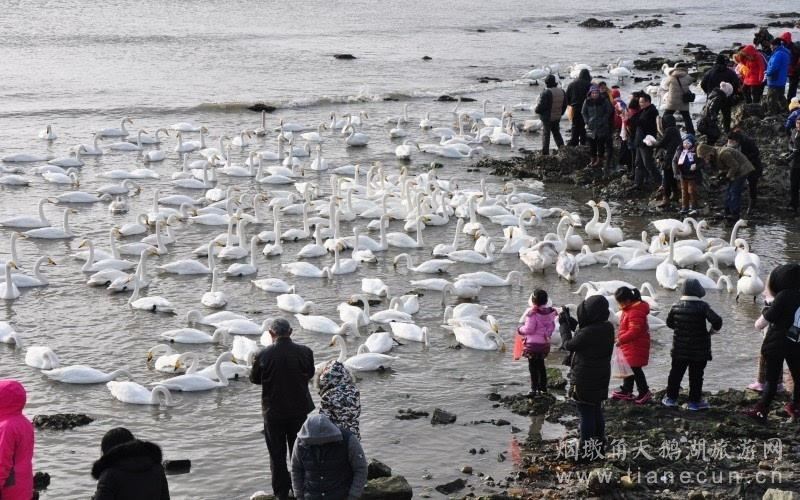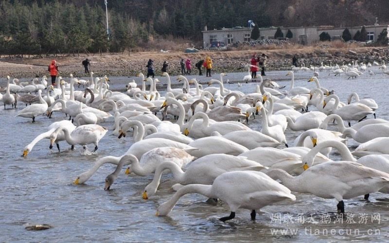 在享用了渔家乐午餐之后,下午我们即将离开烟墩角的时候,雪花又纷纷扬扬的飘落下来,海中的潮水也涨了起来。大家只能在岸上远距离观赏天鹅,而天鹅们也聚集在岸边的水中对人们依依不舍。此时此刻的烟墩角无疑就是一幅人与天鹅和谐相处的最温馨画面。
