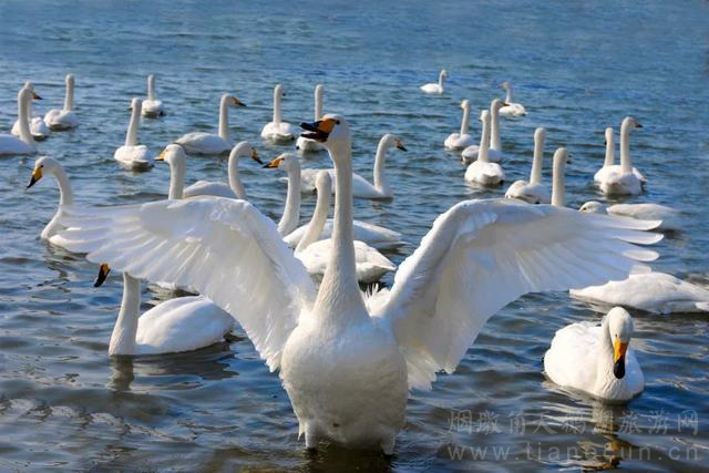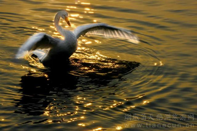 天鹅的鸣叫声划破了神秘而宁静海域。饲养员拎着玉米豆,吹着哨笛,天鹅们翩翩起舞,海面闪烁着道道波光。天鹅沐浴在一片金色的光辉中,这里一下子变得沸腾起来,生机勃勃。