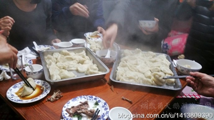 第一次像当地人一样盘腿坐在炕上,摄友们就着小炕桌大快朵颐。先是自家养的大盆炖鸡,然后是用这种不锈钢大盆端上的鲅鱼饺子,用房东的招呼我们的话就是“尽管放开了吃,吃了再上,一定让你们吃个够"。鲅鱼饺子的味道很特别,这么香鲜的饺子估计我们中的大部分人都是第一次吃,果然大家放开肚皮,吃了一盘又一盘,吃的那叫一个爽!