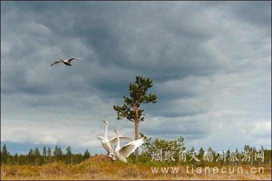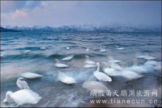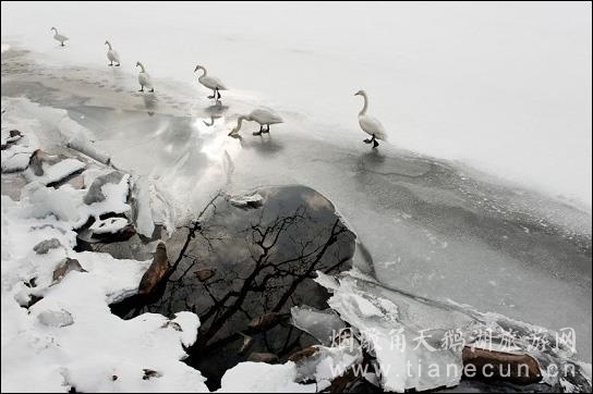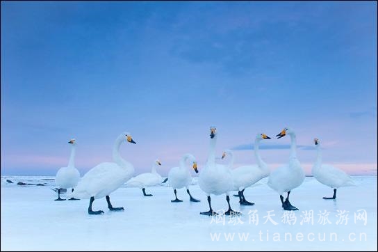 “日本北海道是天鹅在北半球的越冬地之一,每年冬天,成群的大天鹅从西伯利亚飞到北海道的淡水湖过冬,依靠水生植物的叶茎、根为食。大天鹅在5月开始在湿地和河口繁衍后代,10月开始为了过冬迁徙,能够从冰岛跨越1280公里的海域飞到爱尔兰,是跨海迁徙距离最远的天鹅种群。